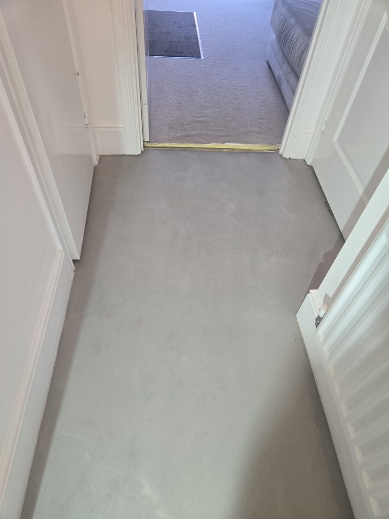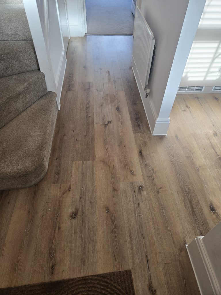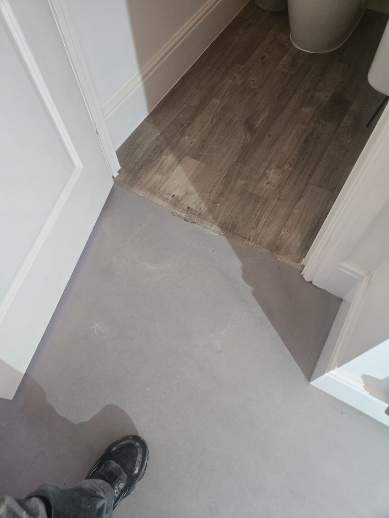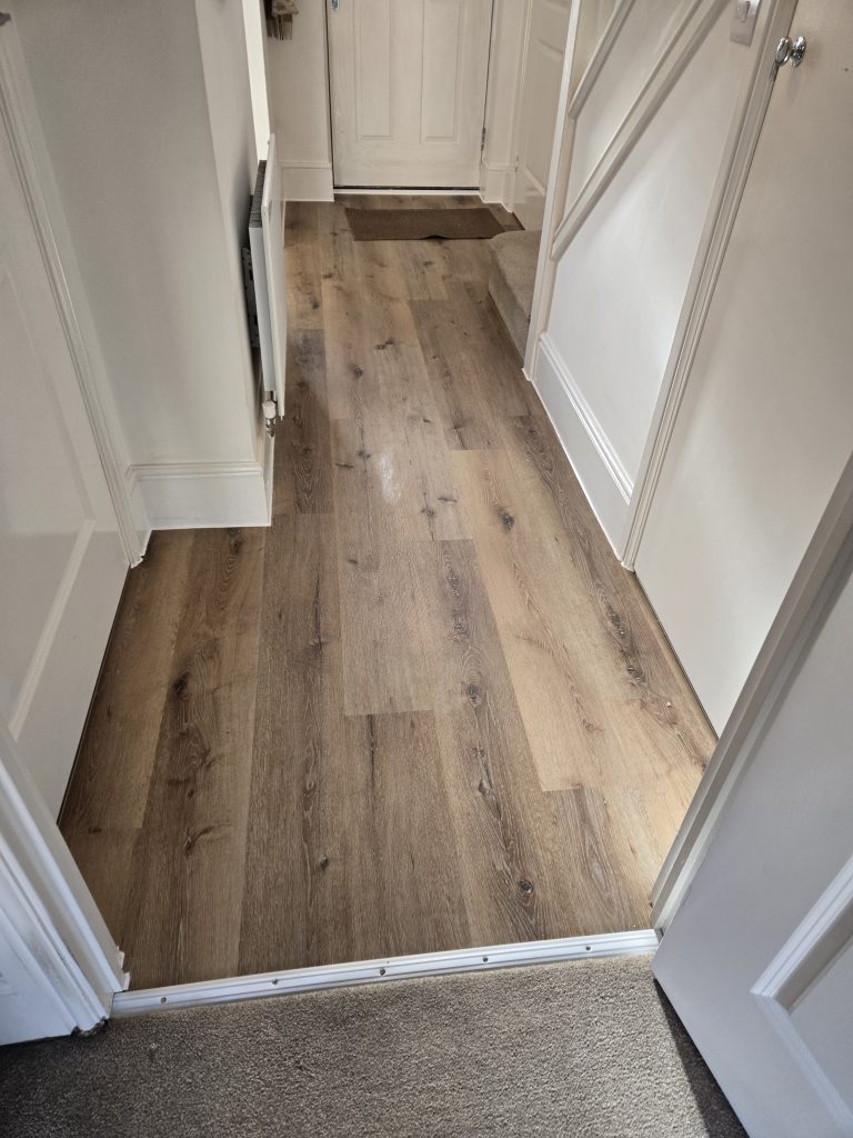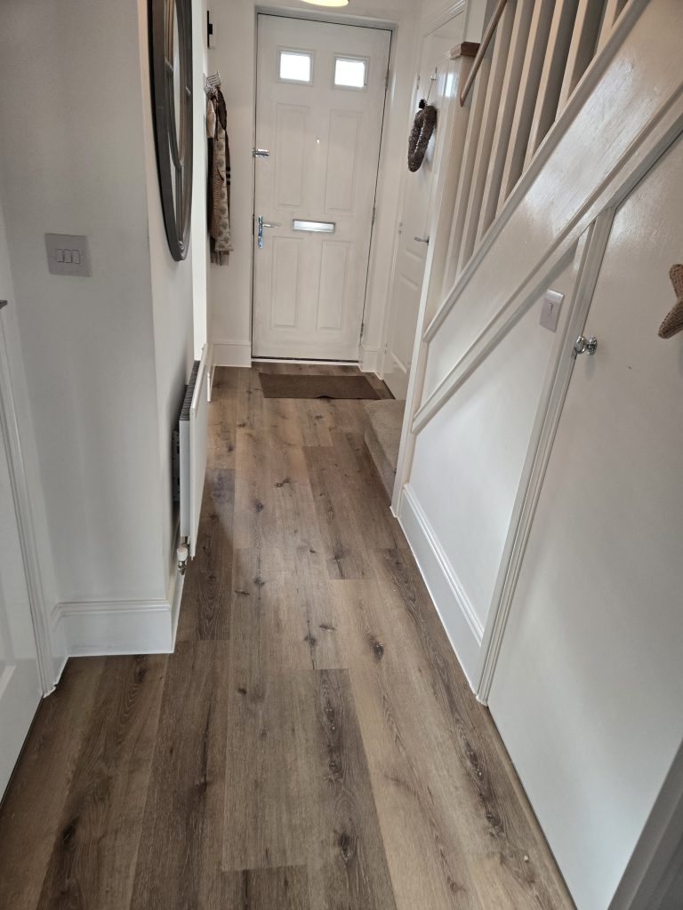 Removed existing flooring to hall. Supplied and laid self levelling. Fitted customer supplied LVT laminate flooring.