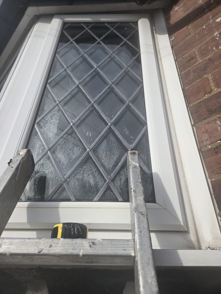 Fitted replacement leaded sealed double glazed unit. Old unit with condensation and pooled water.